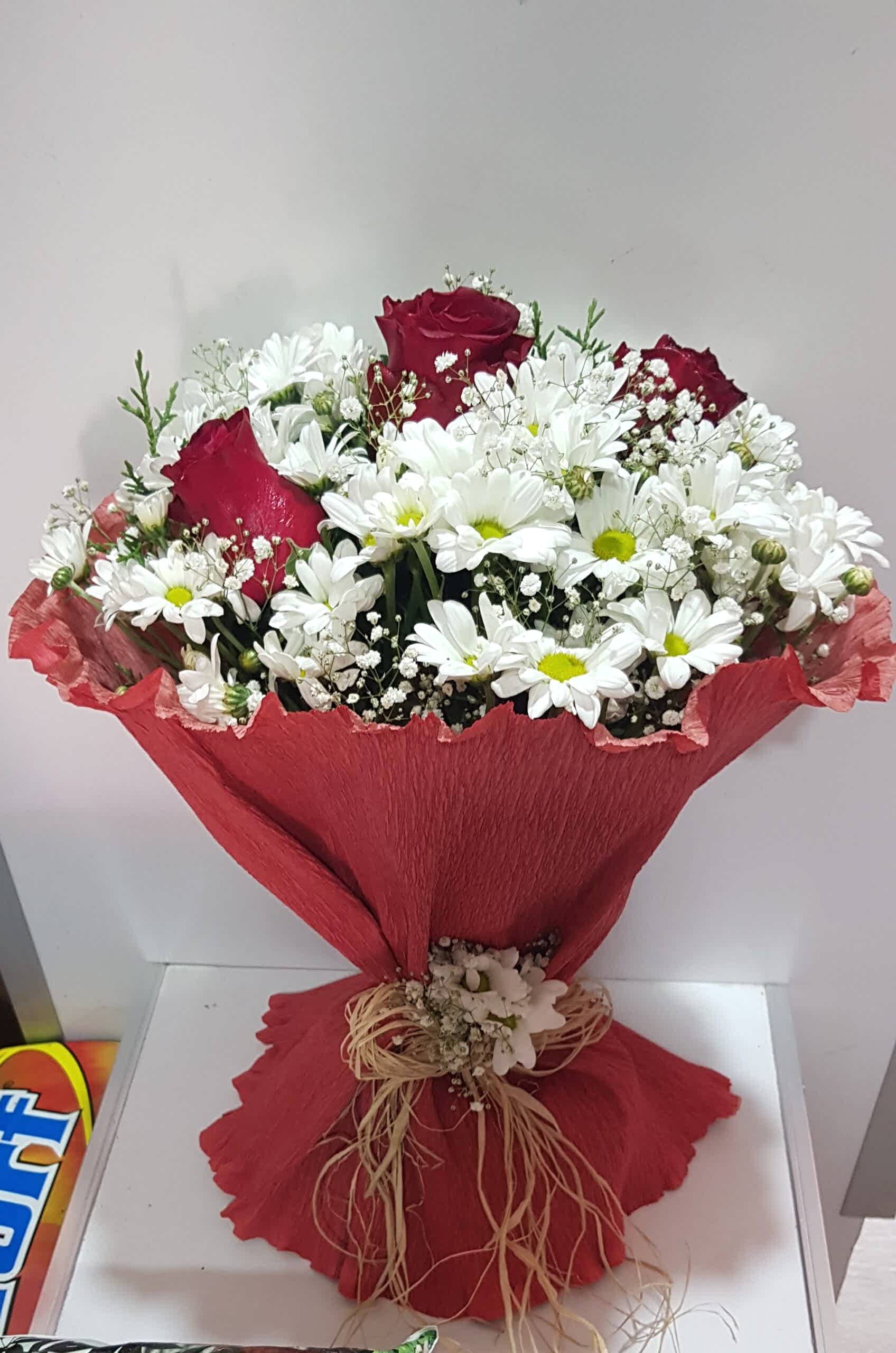 • beyaz papatya ve 3 kırmızı gül buket ⁄
